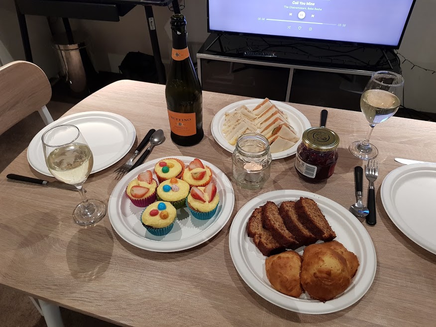 Three hours of baking and sandwich making later, we had platters of chicken sandwiches, smoked salmon sandwiches, banana bread, cupcakes and scones. We then spent an hour whipping single cream into something thick enough to spread on the scones, because it’s been illegal to consume scones without cream since 1825.