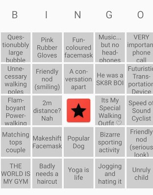 But since lockdown has recently turned everyone’s local park into a veritable circus of amateur yoga, kung fu and shamanic rituals, it was time to create: Craft Bingo – Lockdown Daily Walk Edition. I have actually seen all of the entries on the Bingo card on different days – but I’m yet to get a line, diagonal or 4 corners on the same walk. Let me know if you get BINGO. There’s a special prize.